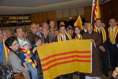 Không khí trong phòng lắng xuống, cảm động, khi ngay trước giờ họp, tất cả bảy nghị viên được đại diện cộng đồng Việt Nam choàng vào cổ một khăn quàng hình cờ vàng 3 sọc đỏ, trước sự cảm động của nhiều người tham dự.
