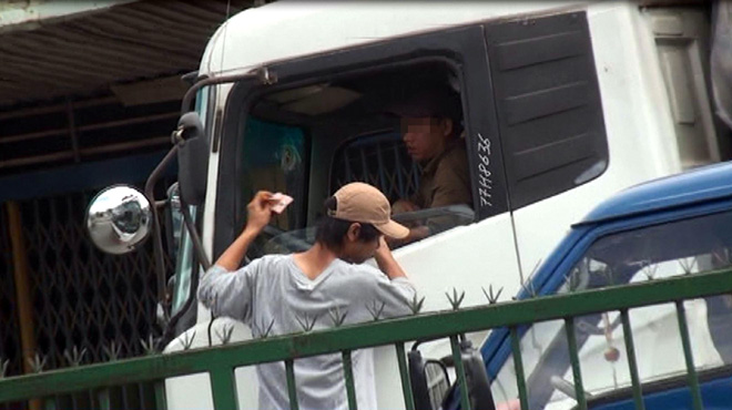Tuổi Trẻ ghi h́nh hơn 20 tài xế bị xin đểu với h́nh thức tương tự như trên. Theo đó, mỗi khi có tín hiệu đèn đỏ, hàng chục xe tải lớn nhỏ phải nối đuôi nhau chờ, lợi dụng lúc này, một nhóm thanh niên thay phiên nhau đi xin đểu tài xế. Nếu không cho tiền, nhóm thanh niên trên sẽ chửi, dọa cho “ăn” kim tiêm. Một người dân khu vực bức xúc kể: “Tụi này ghé vào dọa nạt, lấy tiền tài xế tỉnh rụi.