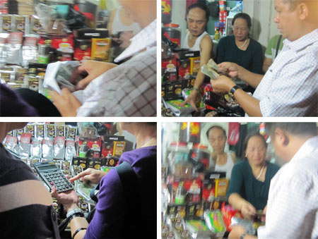 Đáng ngạc nhiên, mọi giao dịch mua bán diễn ra đều bằng ngoại tệ chứ không phải là tiền Việt. Khi khách trả bằng nhân dân tệ, chủ hàng cũng rút trong túi cả một xấp các loại tiền trả lại khách bằng ngoại tệ như một thói quen thường trực. Tương tự một du khách Singapore lựa sản phẩm và được bà chủ thông báo con số 450 (đô-la) trên máy tính.