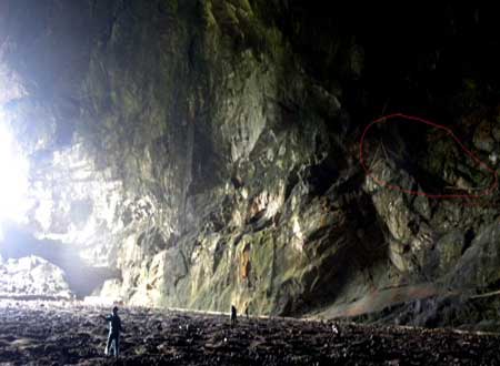 | | Lòng hang Dơi hiện nay rộng hơn 1ha, với vách đá dựng đứng. Trên vách đá vẫn còn những cây mai của người đi leo hang để lại (chỗ khoanh trắng). | Hang Dơi có 2 cửa, gồm một cửa tự nhiên hình bán nguyệt, và một cửa rộng hơn do con người phá, ô tô tải cỡ lớn vào được. Cửa tự nhiên không thể vào được nếu không có dụng cụ leo núi hoặc thang, còn cửa rộng thì đã bị khóa bằng cổng tre căng dây thép gai. Đứng ở đó nhìn vào hang Dơi thấy một khoảng không tối om đến rợn người.