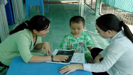 Do mới ngủ dậy, lại thấy có nhiều người lạ nên Huy rụt rè, dù cô giáo nài nỉ cậu học sinh đủ thứ nào là đồ chơi, nào là kẹo… nhưng em vẫn không chịu đọc chữ nào mà chỉ ậm ừ trong miệng những tiếng không nghe rõ. Nảy ra sáng kiến là điện thoại kêu cha của bé đến vì nếu có người thân chắc bé sẽ dạn dĩ hơn, quả thật sáng kiến này đã có tác dụng.