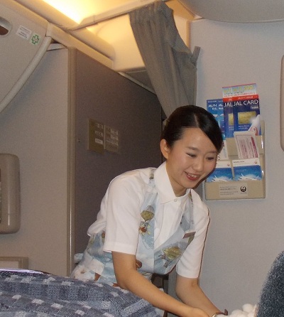 Trên các chuyến bay của hăng hàng không Japan Airlines, nụ cười luôn nở trên môi các tiếp viên. Suốt 6 tiếng trong chuyến bay từ Tokyo về Việt Nam không khi nào tiếp viên ngơi tay. Họ sẵn sàng ngồi, chính xác là "quỳ xuống", giúp khách sửa tư thế của đôi chân tê mỏi.