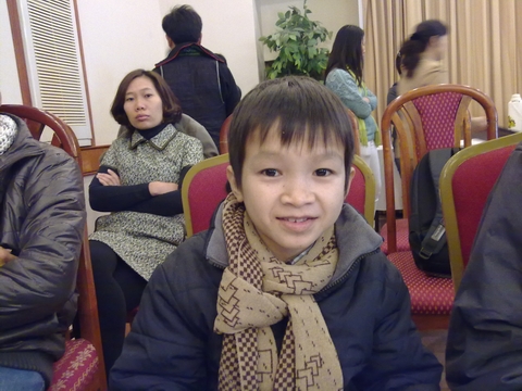 Cậu bé ngồi lọt thỏm giữa những người lớn, khuôn mặt non nớt đeo cặp kính cận nhưng có vẻ rất lanh lợi. Đặc biệt là dáng ngồi của cậu trông rất tự tin với chiếc khăn len quàng cổ ra dáng người lớn hơn so với khuôn mặt và thân hình nhỏ bé.