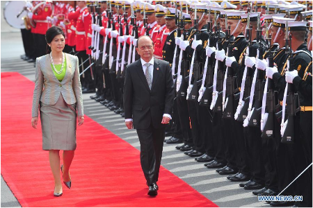 Hình (Xinhua): Tổng Thống Miến Điện Thein Sein (phải) và Thủ Tướng Thái Lan Yingluck Shinawatra duyệt hàng quân danh dự tại phi trường Bangkok, 23-7-2012 nhân dịp ông viếng thăm xã giao Thái Lan.