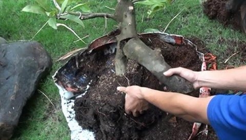 Tiếp đó, Minh lấy một khúc cây lớn hơn cổ tay và chỉ cưa một khúc dài 20cm kẹp giữa hai gốc mai suy. Xong công đoạn tạo dáng, Minh bắt đầu tiến hành các xảo thuật trét bùn vào giữa các kẽ hở.