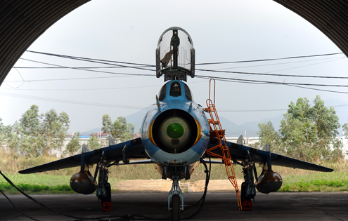 Trung đoàn không quân 921 (sư 371) được trang bị máy bay tiêm kích Su-22. Ảnh: Hoàng Hà. Chính ủy trung đoàn, Thượng tá Nguyễn Trọng Khiêm cho biết, từ tháng 11/2011, đơn vị đã tiếp nhận gần 20 chiếc Su-22. Nếu như trước đó, những cánh bay của Su chỉ xuất hiện ở bầu trời miền Trung trở vào phía Nam thì hiện nay Su-22 được tổ chức bay huấn luyện và sẵn sàng cất cánh chiến đấu trên bầu trời miền Bắc mà trung tâm được bảo vệ là Hà Nội.