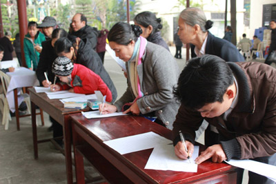 Giáo dân Công Giáo tại giáo xứ Ngọc Long ký kiến nghị đòi bỏ điều 4 Hiến Pháp dành độc quyền cai trị cho đảng CSVN. (Hình: Nữ Vương Công Lý)