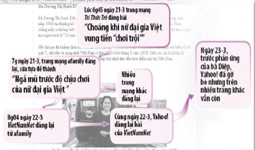 Phía VietNamNet lại cho biết bài viết trên không phải do chính tờ báo này sản xuất mà họ chỉ “cóp nhặt” lại bài viết trên trang mạng afamily.vn của Công ty cổ phần Truyền thông Việt Nam - VC Corp. Nhưng afamily cũng không phải “chính chủ” của bài viết “Ngả mũ trước độ chịu chơi của nữ đại gia Việt” mà họ đã “lượm lặt có sửa chữa” từ bài “Choáng khi nữ đại gia Việt vung tiền chơi trội” của trang Tri Thức Trẻ.