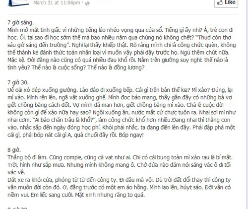7 giờ 30: Uể oải xỏ dép xuống giường. Lảo đảo đi xuống bếp. Cái ǵ trên bàn thế kia? Ḿ xào? Đúng, lại ḿ xào. Ḿnh rên lên, ngă vật xuống ghế. Ḿnh đọc báo mạng, thấy gần đây có những bà vợ giết chồng bằng cách đốt. Vợ ḿnh dă man hơn, giết chồng bằng ḿ xào. Chả lẽ cuộc đời không c̣n ǵ để xào nữa hay sao? Ngồi xuống ăn, nước mắt cứ chực tuôn ra. Nhai sợi ḿ như nhai cơm. “Ai bảo chăn trâu là khổ?”, làm công chức khổ hơn nhiều. Đang nhai th́ thằng con vào, nhắc sắp đến ngày đóng học phí. Khỏi phải nhắc, ta đang điên lên đây. Phải đập phá một cái ǵ, phải bóp nát cái ǵ. A, quả chuối đây rồi. Bóp ngay!