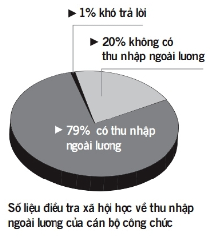 Năm 2012, Thanh tra Chính phủ chủ tŕ, phối hợp với Ngân hàng Thế giới khảo sát gần 2.000 cán bộ, công chức (CBCC) ở 10 địa phương và 5 bộ, ngành. Kết quả cho thấy, 79% CBCC trả lời có thu nhập ngoài lương và các khoản phụ cấp theo lương, 20% không có và 1% không trả lời.