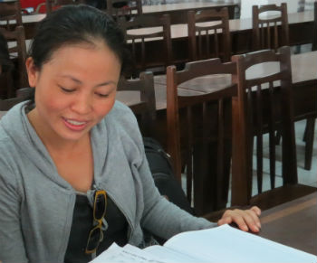 | Công nhân Dung đang trình bày việc bị “tào tháo rượt” phải phá lệ không đội mũ |