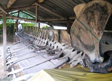 | | Những khúc xương cá voi to lớn khác thường | “Chúng tôi tiến hành làm vệ sinh sạch sẽ bộ xương. Có cả thảy 12 cặp xương sườn (24 chiếc), mỗi chiếc xương dài chừng hơn 1m. Số xương sống thu được là 39 đốt, đều to tướng như chiếc đôn, chiếc ghế. Có vẻ như một số chiếc bị thất lạc.