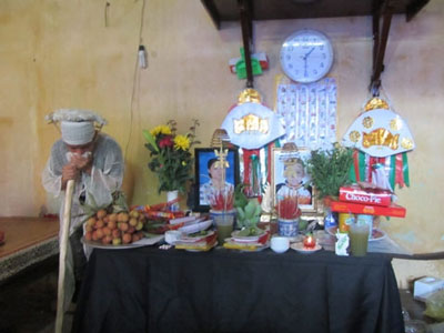 Con trai chị Trần Thị Vở bên linh cữu mẹ và em trai