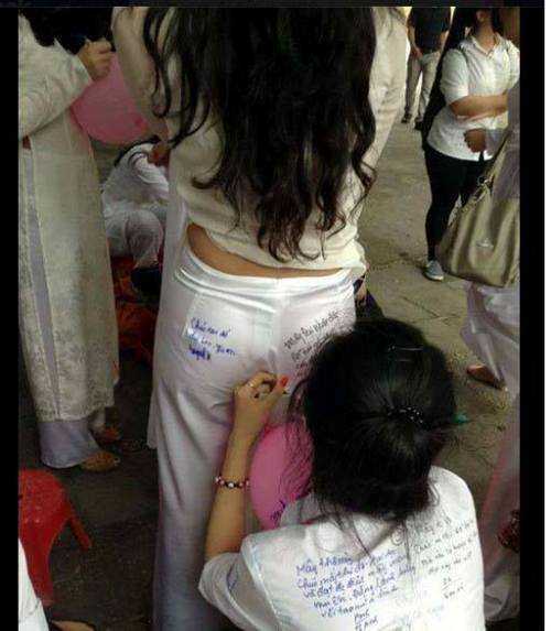 Muốn lưu giữ những hình ảnh về nhau khi sắp kết thúc quãng đời học sinh, các bạn trẻ lớp 12 đã ghi lưu bút lên quần áo của nhau. Tuy nhiên, việc ghi lưu bút lên những chỗ "nhạy cảm" khiến hành động vốn có ý nghĩa này trở nên phản cảm