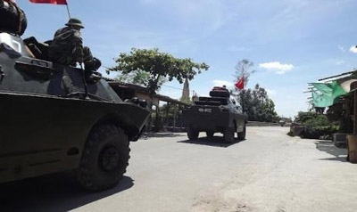 Thiết giáp của quân đội Việt Nam diễu hành qua nhà thờ xã Đoài khi hàng ngàn giáo dân Giáo phận Vinh đổ về để cầu nguyện cho giáo dân Giáo họ Con Cuông. (Hình: Internet)