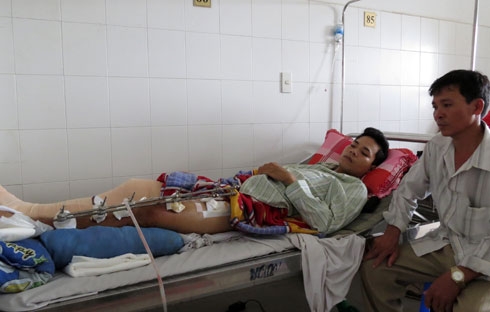 Nằm điều trị trên giường bệnh, cánh chân phải của anh Trường bị mẻ xương và cánh chân trái bị viên đạn bắn gãy rời.
