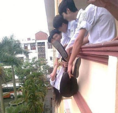 Bức ảnh nhóm 4 nam sinh giữ tay chân của một bạn nữ rồi thả ra ngoài ban công tầng 2 của một trường học lan truyền trên facebook đã khiến nhiều người phẫn nộ.