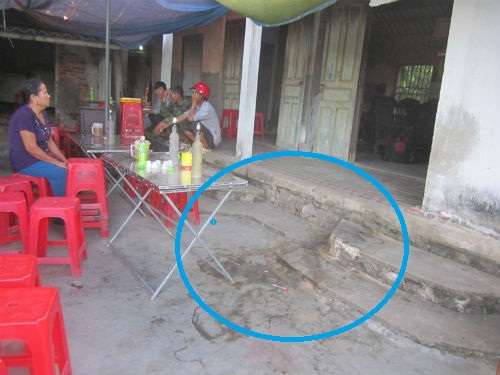 | Hiện trường nơi xảy ra án mạng. Vết máu c̣n loang lổ khắp nền xi măng (ṿng tṛn xanh). |
