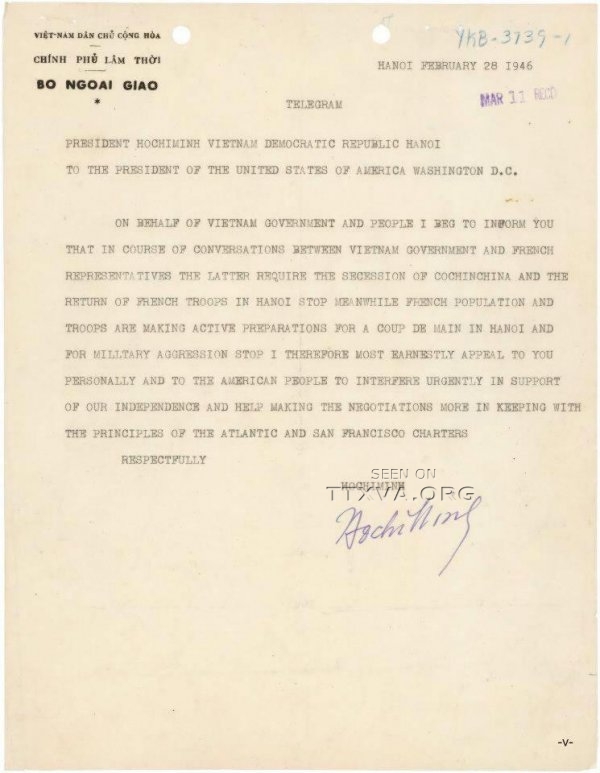 Lần này tại cuộc gặp mặt tại Nhà Trắng, cuối buổi họp báo của hai nguyên thủ quốc gia Hoa Kỳ và Việt Nam, ông Obama đã tiết lộ món quà “qúy báu” mà chủ tịch nước Việt Nam gửi tặng cho ông là lá thư của cụ Hồ gửi cho Tổng thống Truman ngày 28/02/1946, với tư cách chủ tịch nước Việt Nam Dân Chủ Cộng Hòa. Nhưng ông Truman bỏ lá thư này vào thư viện lưu trữ mà không trả lời. Lý do là, tháng 7/1945 lúc đó Hoa Kỳ chưa xác định được cụ Hồ chính là Nguyễn Ái Quốc, nên họ đưa nhóm OSS – Office of Strategic Services – tiền thân CIA sang đào tạo quân đội cho Việt Nam Dân Chủ Cộng Hòa, trong đó có viện trợ 200 ngàn đô la Mỹ. Nhưng đến ngày 02/9/1945 khi người Mỹ thấy cụ Hồ đọc tuyên ngôn độc lập chính là Nguyễn Ái Quốc, và là người của Quốc tế Cộng sản 3, có nhiệm vụ bành trướng chủ nghĩa cộng sản xuống toàn khu vực Đông Nam Á. Nên họ đã làm ngơ và, vì thế mới có hiệp định Genève 1954, và chia đôi đất nước, rồi nội chiến 20 năm.