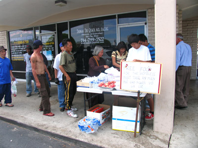 Những người đến đây nhận lănh thức ăn miễn phí phần nhiều là đàn ông Việt Nam, mỗi người được lănh một phần ăn, một chai nước và một phong b́ trong đó có $5 tiền mặt. Trong số này, có nhiều gương mặt rất c̣n tỉnh táo, chỉ độ dăm ba người h́nh như bị bệnh tâm thần.