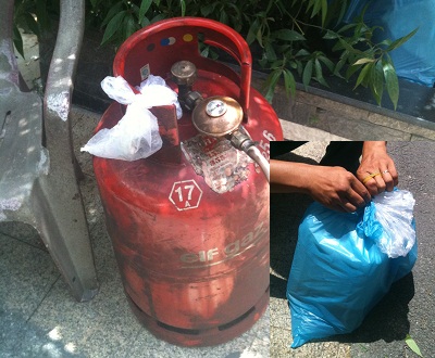 | B́nh ga bị cắt dây và can xăng trong túi nilong |