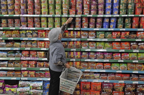 Một khách hàng chọn mua mì gói tại một siêu thị ở Trung Quốc - Ảnh: Reuters |