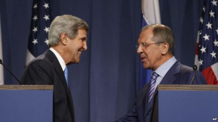 Ngoại trưởng Mỹ John Kerry bắt tay với Ngoại trưởng Nga Sergey Lavrov trong cuộc họp báo tại Geneva trước khi hai ông thảo luận về cuộc khủng hoảng đang diễn ra tại Syria, ngày 12/9/2013.