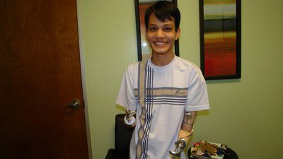 Ngô Thái Hoàng Em trong ngày được lắp đôi tay giả tại Mỹ Tháng Bảy, 2009. (Hình: Ngọc Lan/Người Việt)