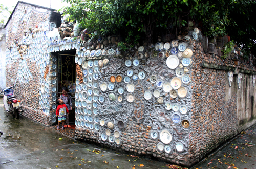 Con đường dẫn vào nhà ông Trường là một ngơ nhỏ lát bê tông, hai bên nhà cửa san sát. Ngôi nhà nh́n từ xa thoáng một nét kiến trúc như cung đ́nh xưa. Trên tường rào có vô vàn bát đĩa cũ, những mảnh gốm vỡ. Vài chục chiếc cối đá xếp thành hàng. Cánh cổng mái ṿm gắn những chiếc b́nh, chiếc đĩa đủ loại hoa văn từ h oa điểu (chim hoa), thạch trúc (tre trúc và đá), tam hữu (hoa mai, cúc, trúc), tùng hạc (chim hạc và cây tùng), lư ngư (cá chép), phượng vũ (chim phượng), phúc lộc thọ...
