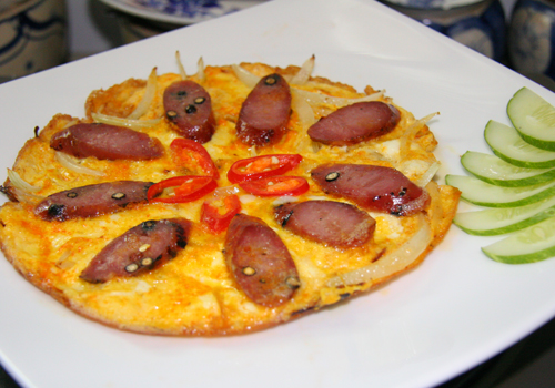 - 3 quả trứng gà, 1 cây lạp xưởng thái lát chiên sơ qua, 1 củ hành tây.
