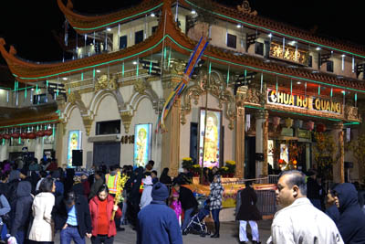 Ngoài sân chùa, rất đông phật tử đứng từng đôi nam nữ, từng nhóm bạn hữu hoặc gia đình, dĩ nhiên là không thiếu đàn trẻ thơ qua những bộ đồ mới. Họ tươi cười vui vẻ, lòng rộn ràng để đón chờ Xuân Giáp Ngọ đến với từng trái tim của người Việt xa xứ.