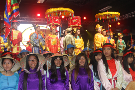 Hàng ngàn người ngồi sẵn trong hội trường đồng loạt đứng lên chào kính lá cờ tổ quốc và cờ Hoa Kỳ được rước lên khán đài. Phía dưới Liên Quân VNCH mặc quân phục giơ tay chào kính. Mũ đỏ Nguyễn Văn Hùng điều khiển nghi thưc chào cờ và mặc niệm. Sau ba hồi chiêng trống, Câu Lạc Bộ Hùng Sử Việt do giáo sư Song Thuận điều động lên khán đài làm nghi thức tế lễ Tổ Tiên.