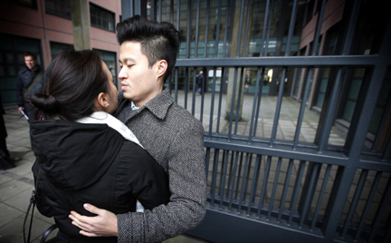 Lee Vũ đang ôm bạn gái bên ngoài tòa hôm thứ Hai 10-2-2014. (Hình: Getty Images)