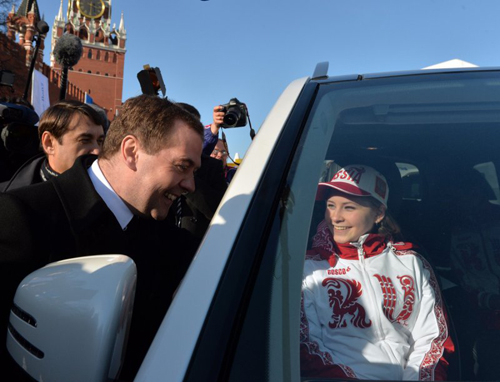 Buổi lễ trao thưởng cho các VĐV giành huy chương cho đoàn chủ nhà Nga diễn ra tại Vasilevsky Spusk, gần Quảng trường Đỏ, Moscow, hôm qua. Đích thân Thủ tướng Dmitry Medvedev là người trao chìa khóa cho các VĐV.