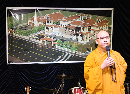 Hòa Thượng Thích Viên Lý, Viện Chủ chùa Điều Ngự phát biểu, phía sau là mô hình chùa Điều Ngự mới.