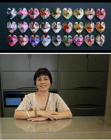 EL CERRITO, Bắc California – Trịnh Nga có được biệt danh là “Nữ Hoàng Tái Chế” không phải bởi vì cô biết rành những loại đồ nhựa nào phải được để vào trong thứ thùng nào, mặc dù việc này cô quá thạo. Nhưng đúng ra là vì trong 13 năm làm việc tại Thư Viện Công Cộng Berkeley, cô đã nhìn thấy một cơ hội để góp phần vào việc tạo ra các tác phẩm nghệ thuật xếp giấy origami của mình: những chất liệu bị hư và bị bỏ của thư viện này. Nhưng đối với cô Nga, một người cư ngụ tại El Cerrito, đó là không phải chỉ là chuyện cô tiếp cận được với nhưng tập giấy danh mục đã cũ, để bẻ, gấp và tại ra những dáng hình, mà còn nhiều hơn nữa: đó cũng chính là thông điệp của cô gởi tới các nghệ sĩ khác .
