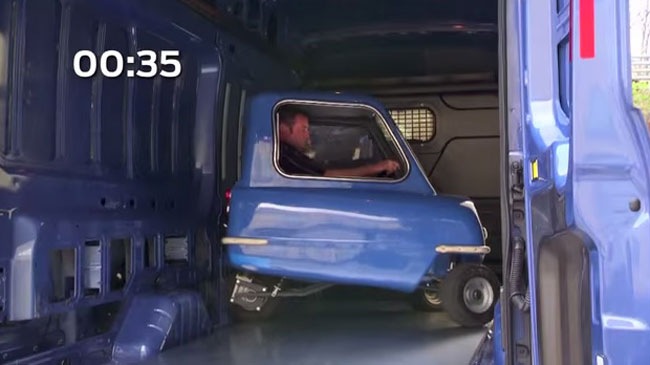 Chẳng cần phải nói ai cũng biết, Peel P50 có thể dễ dàng chui vào trong khoang chở hàng của Ford Transit 2015. Tuy nhiên, quay đầu Peel P50 bên trong khoang chở hàng của Ford Transit 2015 lại là chuyện khác. Cuối cùng, chỉ trong thời gian chưa đến 2 phút đồng hồ, chiếc Peel P50 đã quay đầu thành công trong khoang chở hàng của Ford Transit 2015.
