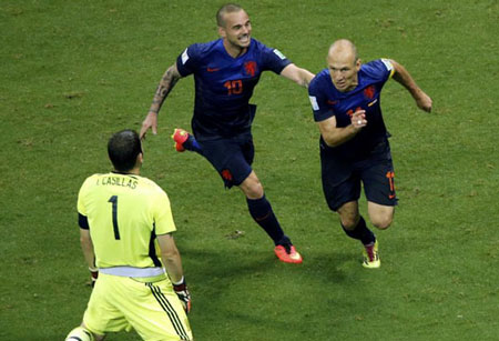 Globoesporte (Brazil): Một lễ hội Carnaval tại Salvador. Robin van Persie và các đồng đội đã tổ chức một bữa tiệc tưng bừng và làm nhục các nhà vô địch Tây Ban Nha. Diego Costa kiếm được một quả phạt đền gây tranh cãi và cuối cùng bị thay ra vì màn trình diễn nhạt nhòa. Robben, tội đồ năm 2010, lập một cú đúp và trở thành biểu tượng không thể tranh cãi cho màn phục hận của Hà Lan. Robin van Persie 4 năm trước gần như mất hút cũng tỏa sáng với hai pha lập công. Ngược lại, Casillas, người hùng tại Soccer City trở thành kẻ tội đồ.