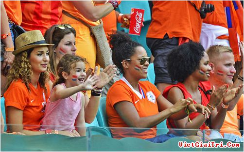 Vợ con, bạn gái của các sao Hà Lan được tới thăm "nửa kia" hai lần ở khách sạn nơi trú quân của đội bóng trước trận thắng tưng bừng tối qua. Không bị cấm gần gũi với chồng, bạn trai nên dàn WAGs nô nức kéo nhau tới Brazil. Trên khán đài sân Arena Fonte Nova rạng sáng nay, vợ Van Persie, vợ Sneijder, bà xã của De Jong và vợ Dirk Kuyt say sưa cổ vũ cho chồng.