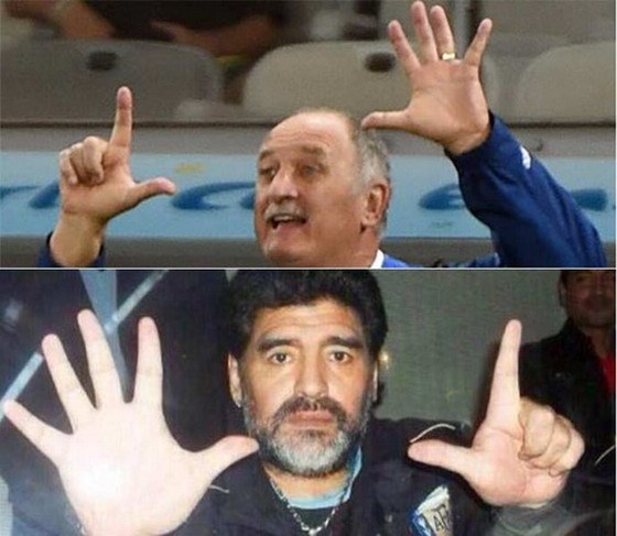 Diego Maradona đưa 7 ngón tay giống như HLV tuyển Brazil Scolari (trên) - Ảnh: O'Globo