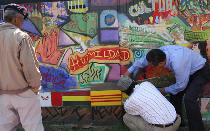 Các thành viên vẽ cờ vàng ba sọc đỏ thay vào chỗ cờ đỏ máu của VC trên bức tường tại góc ngã tư Standard – Chestnut ở thành phố Santa Ana vào sáng thứ Ba. Các em học sinh trung học đã vẽ cờ đại diện các sắc tộc và sơ ý về lá cờ đại diện cộng động người Việt tị nạn tại hải ngoại.