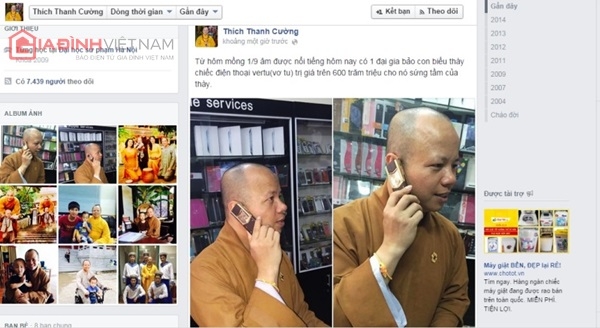Theo đó, trên trang Facebook có đăng nội dung: “Từ hôm mồng 1/9 âm được nổi tiếng hôm nay có 1 đại gia bảo con biếu thầy chiếc điện thoại vertu(vơ tu) trị giá trên 600 trăm triệu cho nó sứng tầm của thầy.” Nội dung trên được đăng kèm bức ảnh sư thầy đang nghe điện thoại.