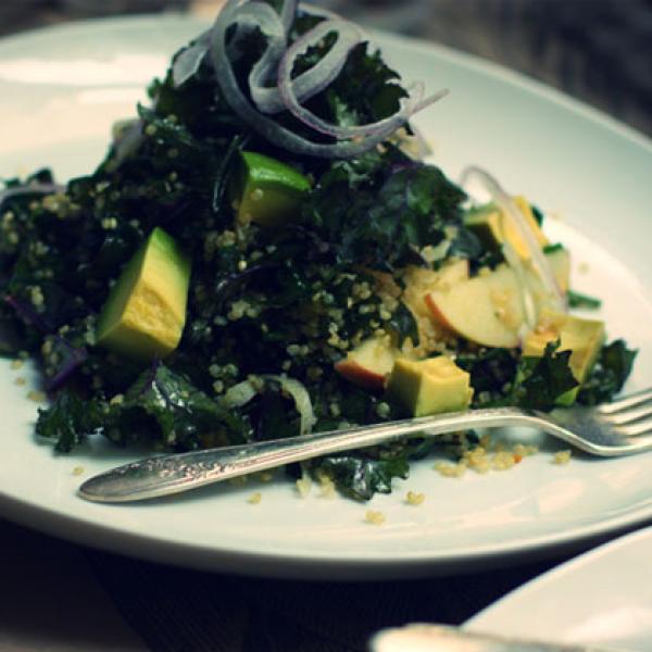 Kết hợp quả qiunoi (quả diêm mạch - chứa nhiều chất xơ và khoáng chất, có tác dụng ngăn ngừa tim mạch, tăng chắc xương và răng), cải xoăn và quả bơ làm thành salad. Đây là sự kết hợp tuyệt vời vì nó chứa 293 calo cho mỗi khẩu phần, 16g chất béo (2g bão hòa), 35g tinh bột, 6g protein, 7g chất xơ, 72mg Canxi, 97mg Natri.