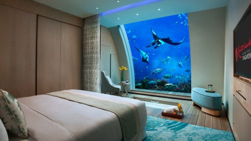 Cảm nhận những điều tốt nhất của cuộc sống trên và dưới biển với khu nghỉ dưỡng thế giới - Sentosa, dãy phòng hai tầng nằm ở phía bên của một trong những thủy cung lớn nhất thế giới. Tầng cao nhất nằm ngày trên bề mặt của nước, nơi bạn có một hồ bơi riêng. Tuy nhiên, đi xuống cầu thang vào phòng tắm và phòng ngủ, và bạn có thể thư giãn trong bồn tắm Jacuzzi, bạn có thể nhìn ra vào thủy cung khổng lồ. Hoặc nằm trên giường khi mà cá đuối gai độc lướt qua trước mắt bạn. Trên hết, khách hàng được hưởng dịch vụ năm sao với một quản gia riêng có mặt để chăm sóc mọi nhu cầu của họ..