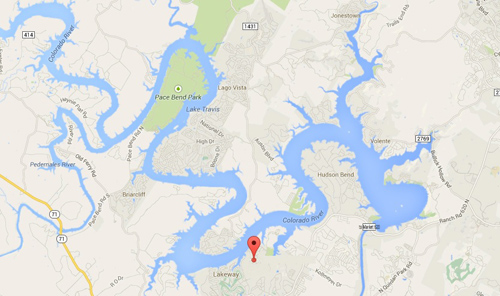 Ngôi nhà của chuyên gia tư vấn phong thủy Kathryn Weber đang sống ở gần hồ Travis, Austin, Texas. Nhìn vào bản đồ dưới đây, bạn có thể thấy hình dáng hồ Travis như một con rồng uốn lượn. Đó cũng là lí do tại sao cô chọn sinh sống ở khu vực này. Hơn nữa, việc nguồn nước nằm ở phía Tây Nam của ngôi nhà cũng tăng thêm các nguồn năng lượng tốt về tài vận cho ngôi nhà.