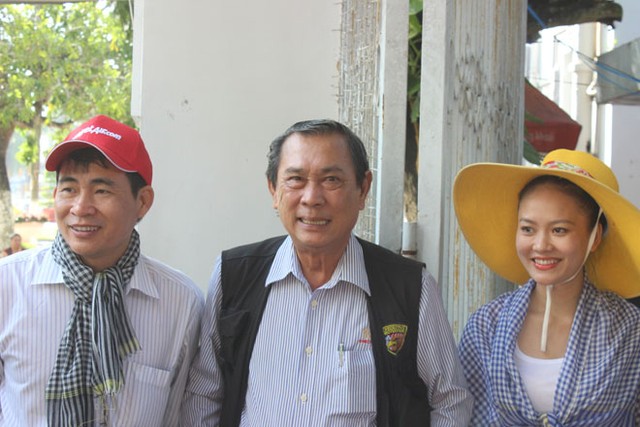 Ông Trần Trinh Đức (giữa) con trai của công tử Bạc Liêu chụp ảnh cùng khách du lịch đến thăm quan ngôi nhà từng là của gia đình ông.