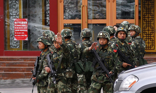 Cảnh sát Trung Quốc đứng bảo vệ hiện trường trong một vụ bạo loạn tại Tân Cương. Ảnh minh họa: Reuters