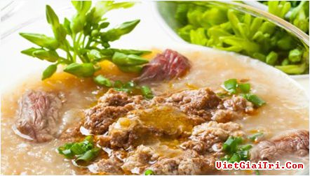 Gạo tẻ vo sạch cho vào nồi ninh thành cháo, khi chín cho thịt bò và tỏi vào đun sôi một lát là được, bỏ rau thơm và chế đủ gia vị, ăn nóng trong ngày. Công dụng: khu phong trừ hàn, làm giảm xuất tiết và thông lỗ mũi. Dùng cho người bị viêm mũi dị ứng với triệu chứng như: chảy nước mũi trong, hắt hơi nhiều, ngạt mũi…