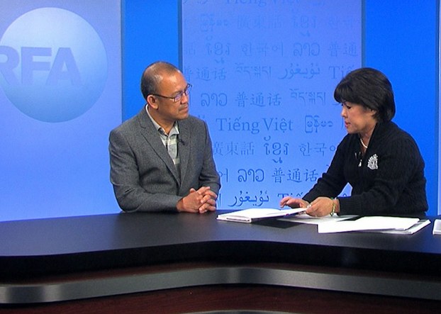 Phóng viên Kính Hòa (trái) và chị Triều Giang trong tại studio RFA tháng 10, 2014-RFA