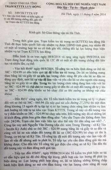 Gần nhất, theo báo cáo của Sở GTVT tỉnh Hà Tĩnh gửi Công an huyện Kỳ Anh, vào lúc 8h40 ngày 8/8/2014, trạm kiểm tra tải trọng lưu động thuộc Sở GTVT tỉnh Hà Tĩnh ta hiệu lệnh dừng xe ô tô tải 38C-024.99 có dấu hiệu quá tải để kiểm tra. Khi xuống xe, tài xế không xuất trình được bằng lái và giấy tờ xe nên tổ công tác đã yêu cầu đậu xe đúng nơi quy định, đồng thời yêu cầu lái xe này thông tin cho người nhà mang các loại giấy tờ trên đến. Trong lúc lực lượng chức năng đang làm việc với lái xe, Võ Thành Trung là chủ xe lao tới, ngang nhiên lên xe 38C-024.99 điều khiển xe bỏ chạy.